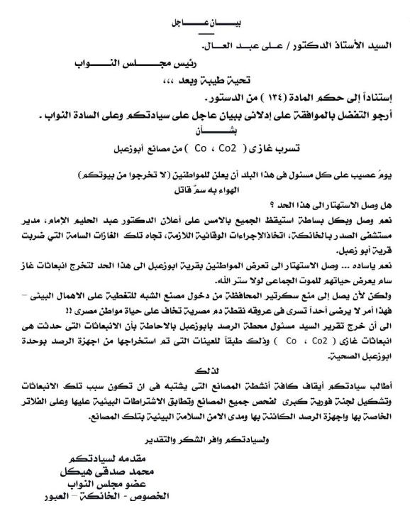 بمجرد انقضاء المرحلة الثانية من مشروع التوافق البيئي لمصنع أبو زعبل للأسمدة، تقدم النائب عن محافظة القليوبية محمد مدينة بطلب إحاطة عن استمرار الانبعاثات الملوثة الناتجة عن مصنع الأسمدة.