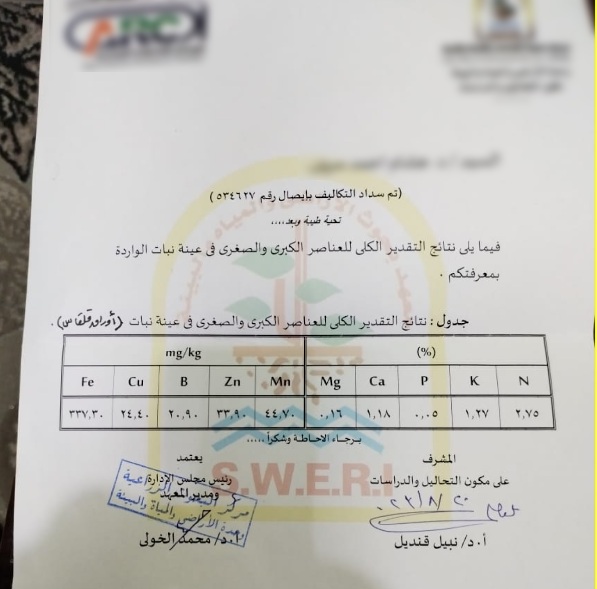 بمساعدة أهالي عزبة سمك، حصلنا على عينة من بعض مزروعات العزبة، وبعد تحليلها من قبل مختصين بأحد معامل الدولة، تبين ارتفاع نسبة الحديد داخل عينة النبات، فكان نصيب ورقة النبات الواحدة 337.30 غرام.