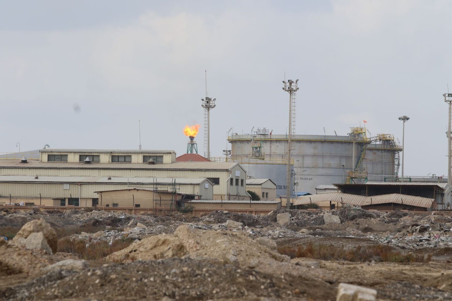 من مبنى الإدارة تُرى مداخن تسييل الغاز و “غاز الشعلة” كمؤشر تشغيل، وتنبعث منها غازات ثاني أكسيد الكربون والميثان. الغازات المتصاعدة التي أتعبت صدور السكان ترفع نسب ثاني أكسيد الكربون، فيما تسجل بحيرة المنزلة قدرة عزل 7.79 جيغا غرام كربون/سنة، الأعلى بين بحيرات مصر الشمالية بحكم المساحة، تليها مريوط (5.09)، البرلس (4.47)، إدكو (0.99). مع ذلك تبقى قيم العزل في بحيرات مصر أدنى من مثيلاتها في أوروبا وأميركا الجنوبية والمناطق الباردة بسبب تسارع التحلّل العضوي في الحرارة المرتفعة.