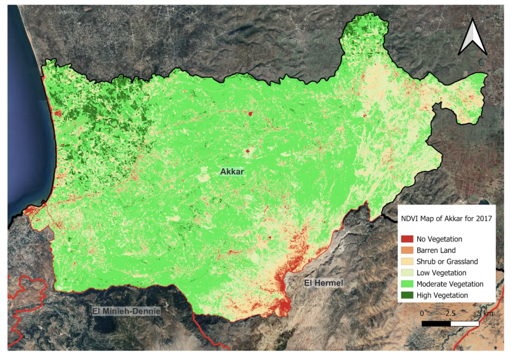 تُظهر صور الأقمار الصناعية وخرائط مؤشر الغطاء النباتي في منطقة عكار على وجه الخصوص، تحسناً ملحوظاً في بعض المساحات الخضراء عام 2024، مقابل تراجع حاد في مناطق أخرى؛ إذ تقلصت المناطق المصنفة غير مزروعة إلى قرابة نصف ما كانت عليه عام 2020. كما تقلصت المناطق المصنَّفة أراضي مفتوحة، ومناطق عشبية، وغابات منخفضة الكثافة إلى أقل مستوياتها منذ عدة أعوام. في المقابل، تضاعفت مناطق الغابات الكثيفة ثلاث مرات مقارنة بما كانت عليه عام 2020.