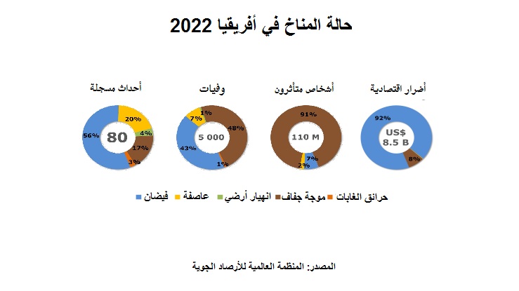 وتأثر أكثر من 110 ملايين شخص في القارة بشكل مباشر بالمخاطر المرتبطة بالطقس والمناخ والمياه في عام 2022، مما تسبب في أضرار اقتصادية تزيد قيمتها عن 8.5 مليار دولار أمريكي.