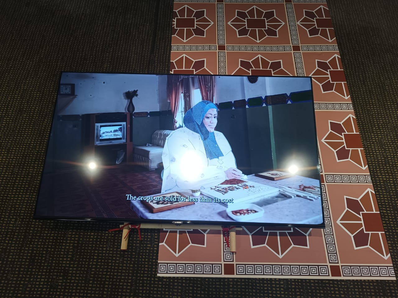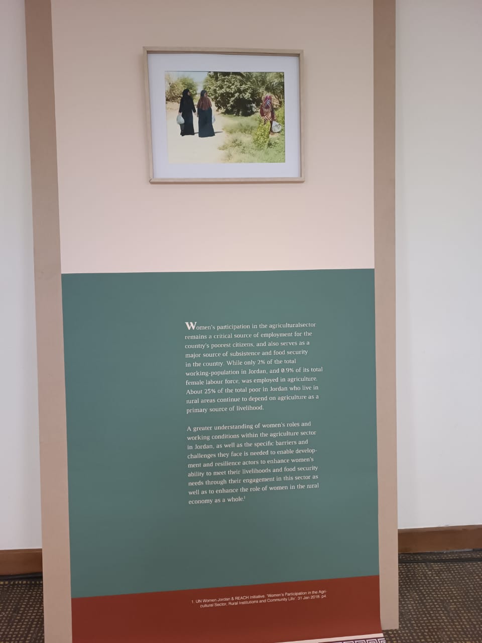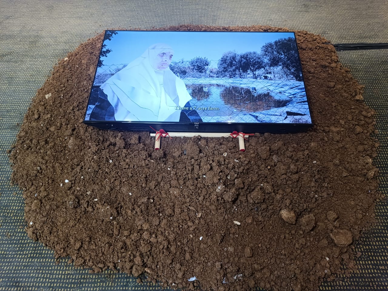 أما القصة الثالثة فكانت بعنوان “أصوات من الوادي: مصانع “مروية” ومزارع عطشى بالأردن”، من عن معاناة النساء من منطقة الغور القريبة من البحر الميت في الأردن، والتي تعتبر موقع زراعي بتربة بخصبة صالحة طوال العام، لكن مع ندرة المياة، واحتكار المياة الجوفية من قبل شركات متعددة الجنسيات في المنطقة، تعاني النساء المزارعات العاملات باليومية في هذه الحقول، اللاتي تعبر الكثيرات منهن المعيلات الرئيسيات لعائلتهن، يوثق ويجسد هذا المعرض قصة هؤلاء النساء خاصة مع تأثير التغير المناخي عليهن الذي يضاعف من معاناتهن في كسب قوت يومهن، وتم تمثيل القصة بالتصميم الجرافيكي الذي يوضح مقابلة مع إحدى هؤلاء النساء ووجودها في المنطقة وحكيها لمعاناتها، كما تم وضع شاشة كبيرة تشرح ذلك على قطعة طين لتظهر تناغم القصة مع الأجواء العامة التي تتحدث عنها.