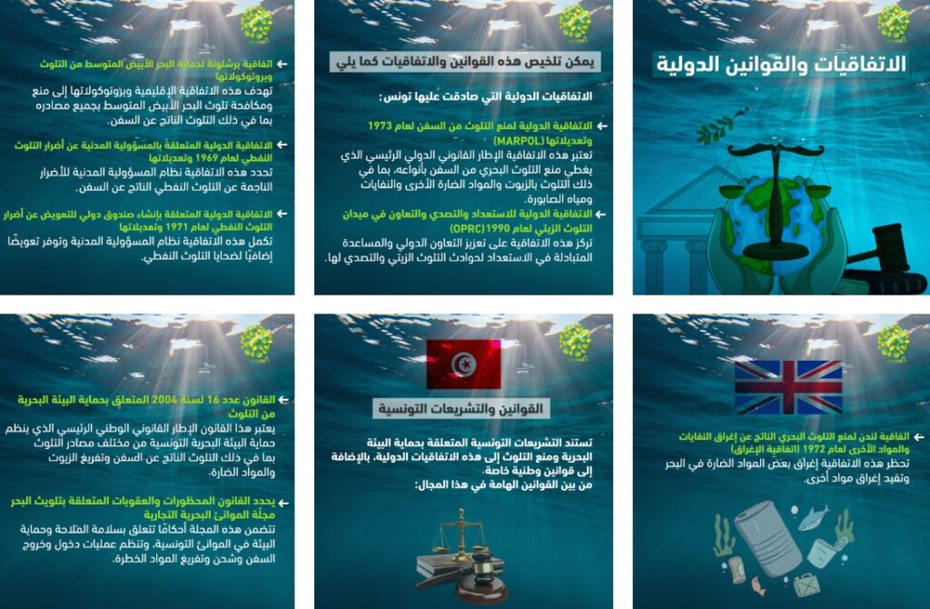 تعتبر تونس، كدولة ساحلية تطل على البحر الأبيض المتوسط، ملتزمة بمجموعة من القوانين والإتفاقيات الدولية التي تهدف إلى منع تفريغ الزيوت والمواد الضارة الأخرى في عرض البحر وحماية البيئة البحرية.