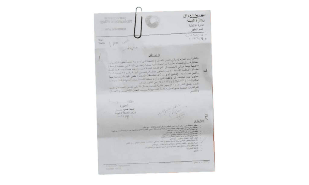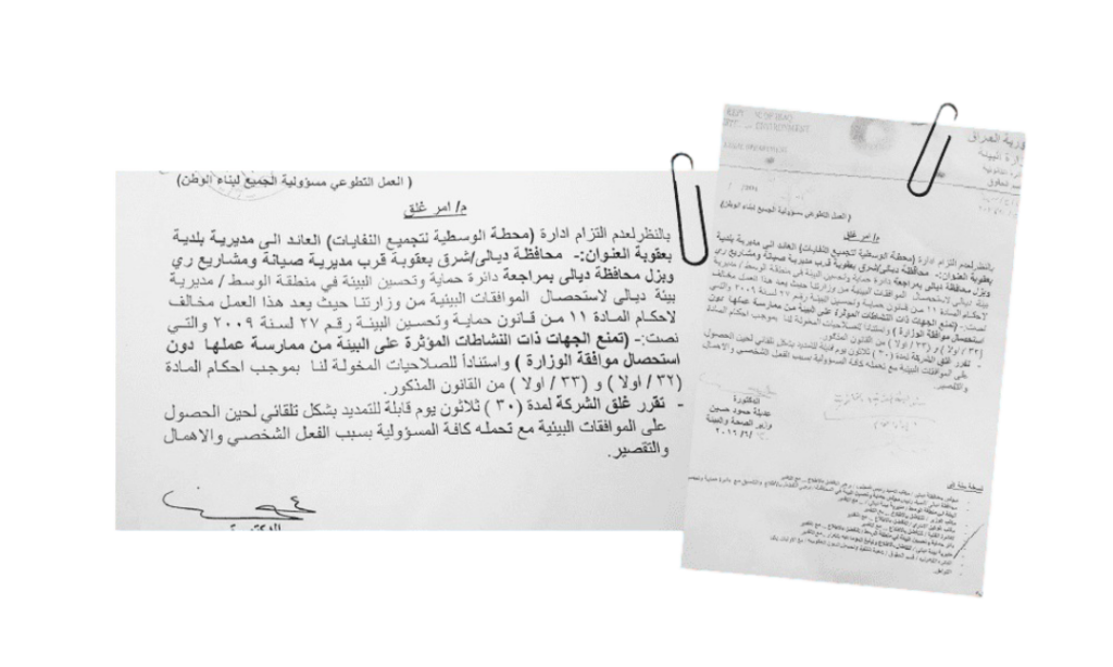 وتشير الوثائق إلى أن هذا الإجراء اتّخذه، بناءً على”الزيارة الميدانية المشتركة”، كل من مديرية بيئة ديالى وقائمقام قضاء الخالص. كما تؤكد ضرورة “إكمال الإجراءات والموافقات البيئية” للموقع الجديد قبل الانتقال إليه، وهي خطوة لم تنفّذ حتى وقت نشر التحقيق.