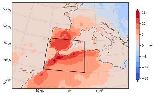 Figure 1. ERA5-extended maximum daily temperature anomaly with respect to 1991-2020 averaged over 26-28 April 2023. The black box outlines the study area.