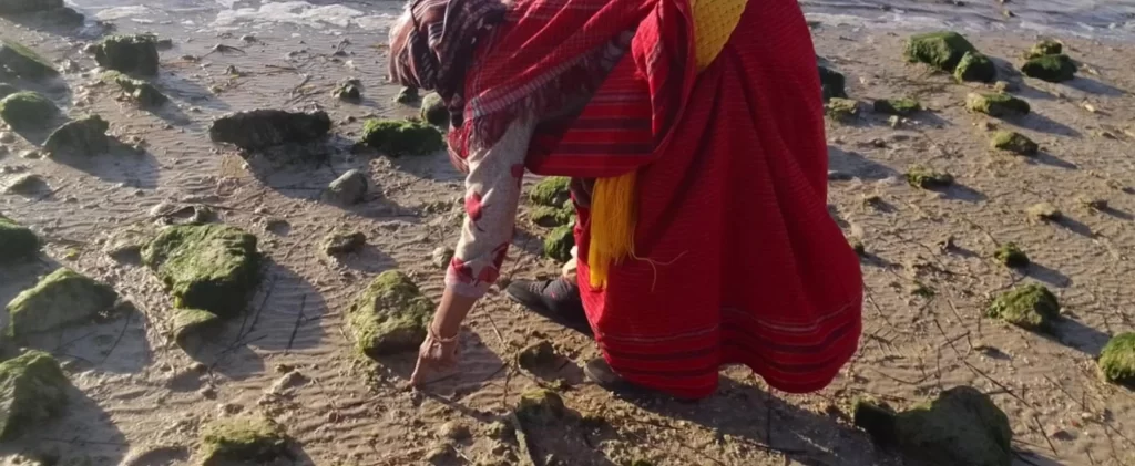 حين يظفرن بمكان يتوفر فيه المحار، يسرعن إلى صيده منحنِيات لساعات طويلة في الماء، تقول فاطمة: “تظهر علامات وجوده في التراب فنلتقطه بالمنجل، ثم نضعه في السطل”.
