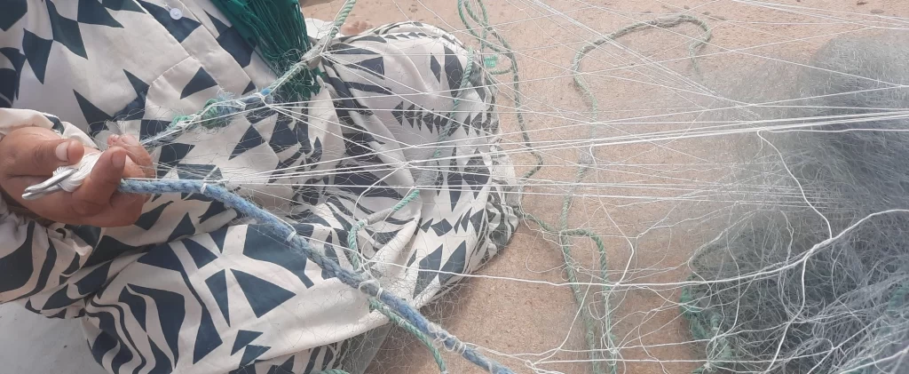 في ساحة منزلها، جلست مبروكة قشاط (44 عاماً) القرفصاء ترتق شباك الصيد بخفة، ولا تنهض من مكانها إلا لدقائق معدودة، تتفقد وجبة الغداء قبل عودة ولديها من المدرسة. مبروكة هي جامعة محار من منطقة بوغرارة الساحلية التابعة لولاية مدنين، وتعمل أيضاً في رتق الشباك لإعالة أسرتها بعد وفاة زوجها. تقول: “نذهب أحياناً للعمل بواسطة المراكب، نغادر بيوتنا حتى قبل أذان الصبح؛ ربما في الثالثة فجراً”.
