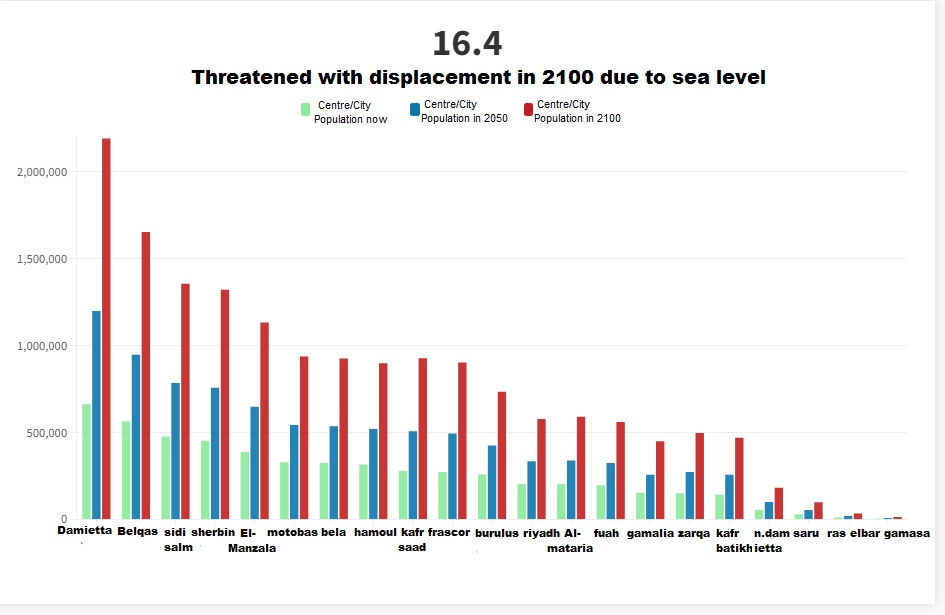 This data-driven investigation reveals how slowing down the achievement of global climate goals could lead to the exacerbation of global warming, a rise in sea level by 1 meter by the end of the century, threatening 21 Egyptian cities in the Delta region with flooding, and affecting the stability of the livelihoods of more than 5 million Egyptians living in three of the most important agricultural governorates of Egypt.