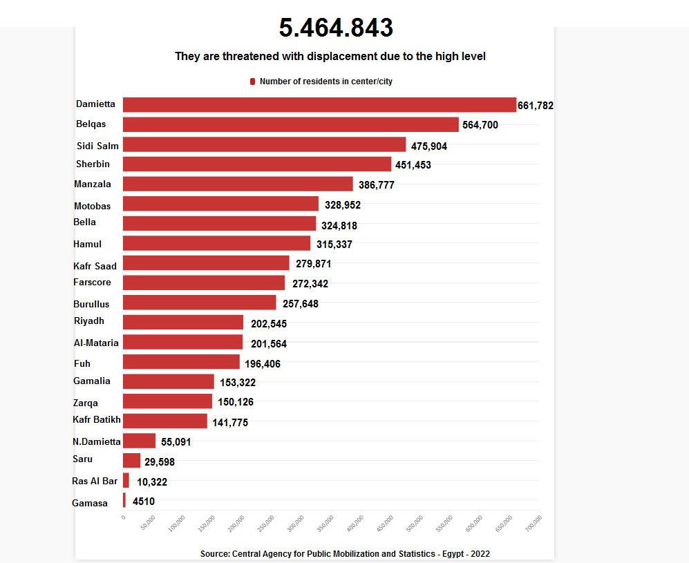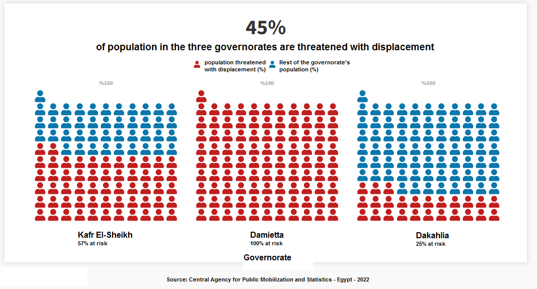 Regarding the proportional distribution of the population of the region, 55% of them live in the three threatened governorates (Kafr El-sheikh, Damietta, and Dakahlia), with a total of about 12.2 million people.