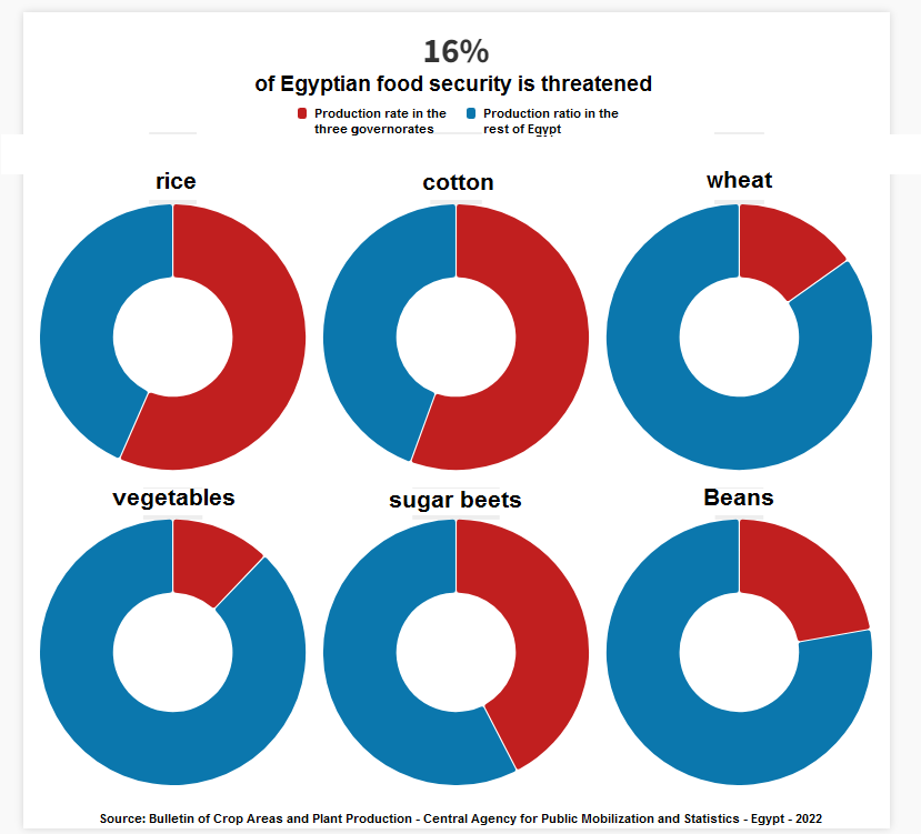 The threatened cities are located within three of Egypt’s most important agricultural governorates, and the most productive for strategic crops, such as (wheat, rice, sugar, beans, cotton), and multiple varieties of vegetables and field crops.