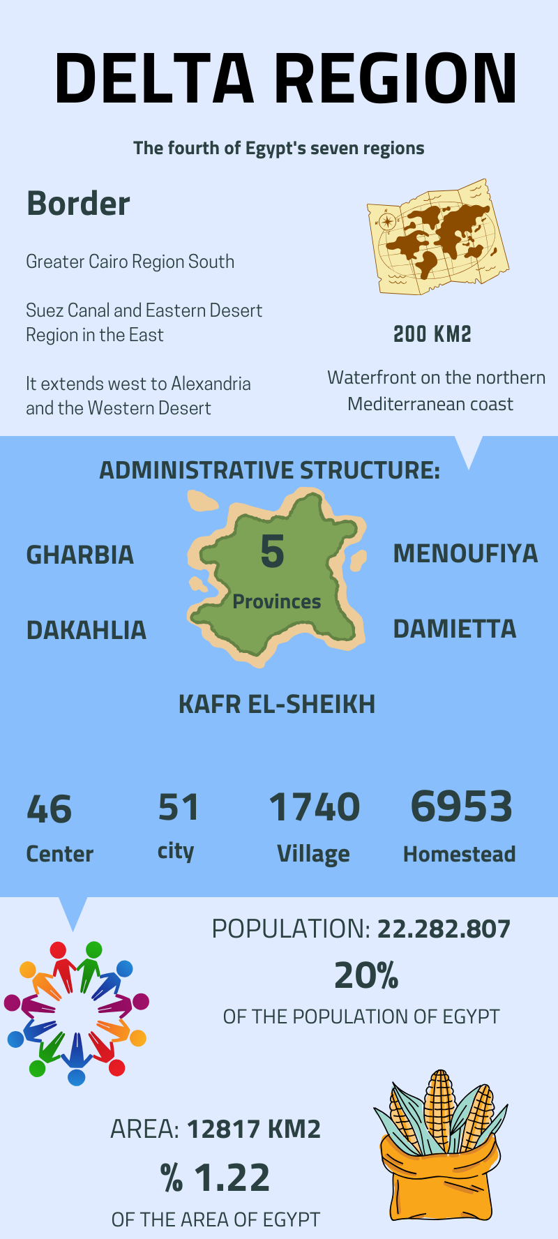 According to the development strategy for the governorates of the Republic, the Nile Delta region is the fourth of Egypt’s seven regions, with an area representing about 1.22% of the total area of the Republic, and a total population of over 22 million people.