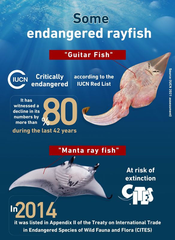 According to the IUCN Red List, in an assessment issued in 2021,the common guitarfish is classified as ‘Critically Endangered’ and has seen its population decline by more than 80% over the last three generations (42 years), based on abundance data and actual levels of exploitation while the manta ray is classified as ‘Vulnerable to Extinction’ “.