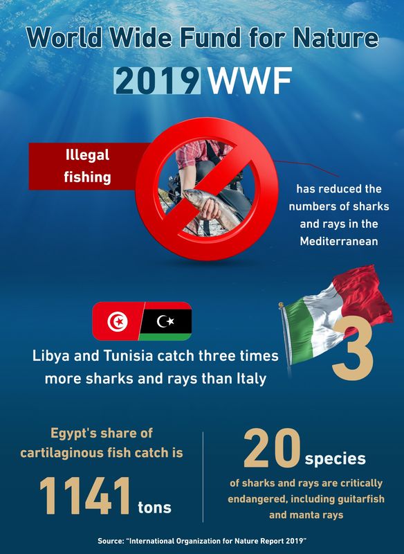 In 2019, a report by the International Organization for Conservation of Nature said that the unsustainable and illegal fishing led to the depletion in the number of sharks and rays in the Mediterranean region, and it was found that Libya and Tunisia catch sharks and rays three times more than Italy, whose share reached 1,347 tons, followed by Egypt, which had a share of catching sharks and rays, according to the report, of “1141 tons.”