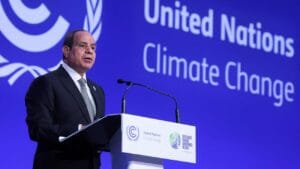 أعلن السيسي، خلال كلمته أمام قمة الأمم المتحدة لتغير المناخ Cop26 والمنعقدة فى جلاسكو، خطة مصر للتحول الأخضر، ومواجهة تغير المناخ في مصر.